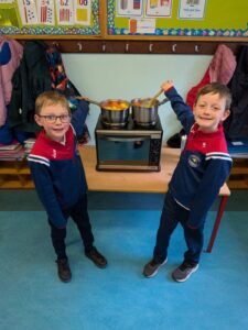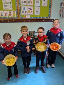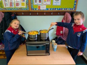 Rang a hAon harvested the carrots they planted last year and were amazed by how big some of them had grown. As part of their work on procedural writing in Literacy, they used this opportunity to make carrot and potato soup. The children carefully followed each step of the process and then wrote their own recipes afterwards. The soup turned out delicious, and everyone really enjoyed tasting the results of their hard work.